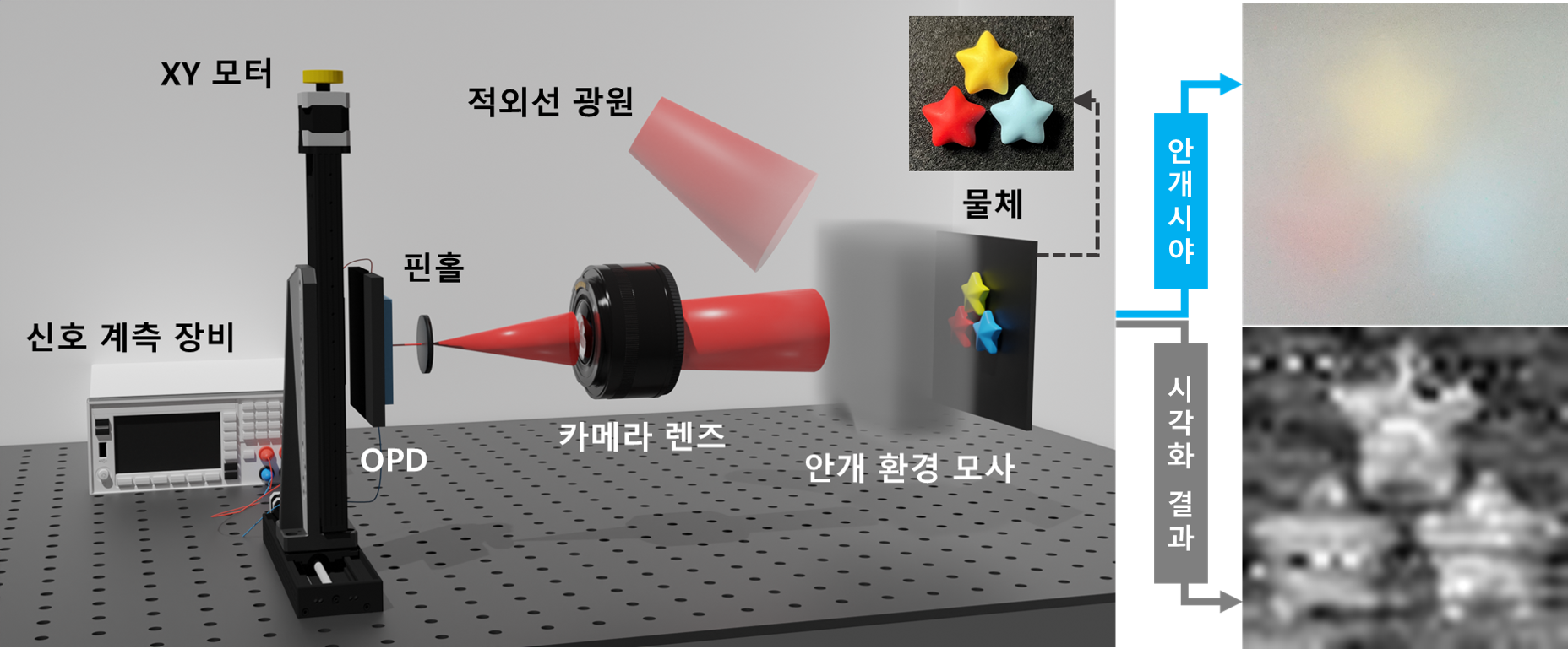 한국과학기술연구원(KIST, 원장 오상록) 양자기술연구단 박민철 박사 연구팀은 고려대학교 심재원 교수팀, 동국대학교 조제웅·이세연 교수팀과의 공동연구를 통해, 산란광 환경에서도 초저잡음으로 작동하는 고감도 유기 광검출기(OPD, Organic Photodetector)를 개발했다고 밝혔다. 연구팀은 이를 통해 실제 안개 및 연기 환경에서 투과 영상을 복원하고, 그 성능을 정량적으로 평가하는 데 성공했다.