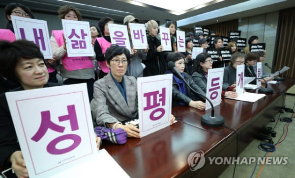 지난 2월 초 김문정 한국여성단체연합 공동대표(왼쪽)가 서울 여의도 국회에서 열린 심상정-여성계 총선정책간담회 ‘정의당, 미투 이후 국회를 부탁해!’에서 발언을 하고 있다.