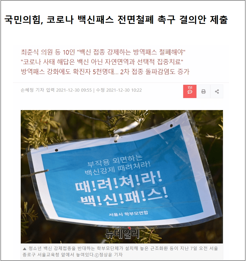 1. 대한민국 국회는 감염 예방 효과가 떨어져 돌파감염을 양산하는 동시에 심각한 부작용 가능성만 존재하는 백신이 코로나 사태의 답이 아니라는 것과, 비접종자의 자연면역이 백신보다 훨씬 강력하고 광범위한 면역을 제공한다는 것을 정부가 인정하고 국민들에게 사실상 백신 접종을 강제하는 방역패스(청소년 포함)를 즉각 철폐할 것을 촉구한다.