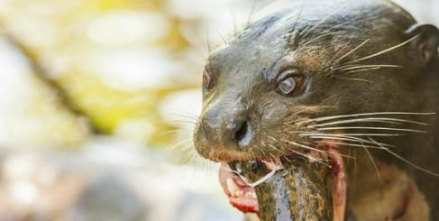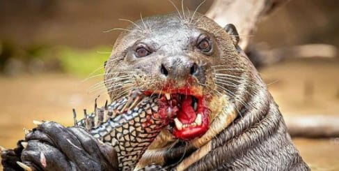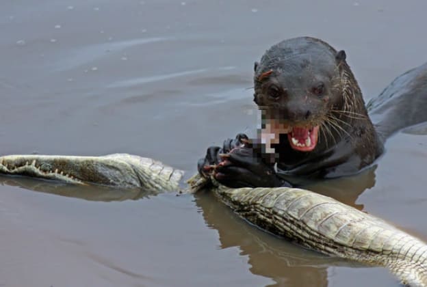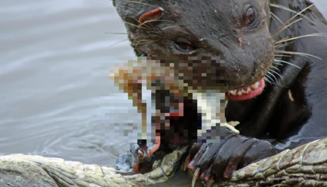지상 최대의 수달인 남미 왕수달이 악어의 한종류인 카이만을 죽인 뒤 잡아먹고 있다.