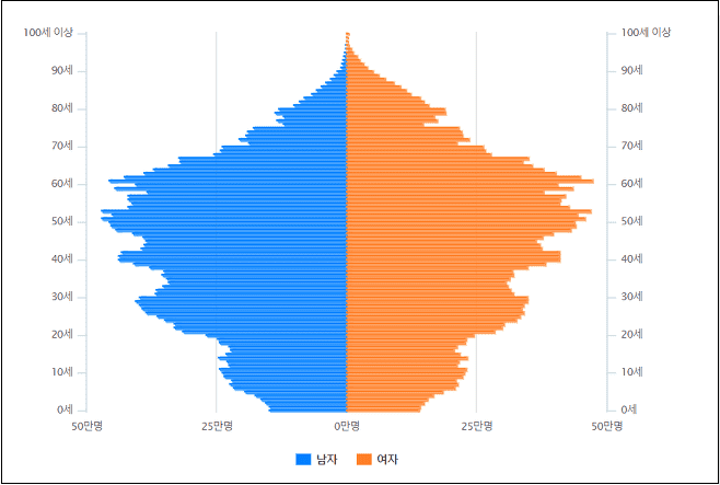한국의 20~30대에게 미안한 마음이 드는 2022년 한국의 인구 피라미드. 현재는 40~50대가 두터운 항아리형이지만 시간이 흐를수록 60세 이상이 점차 두터워지는 역삼각형 구조로 변한다./통계청