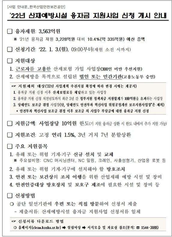 안전보건공단 관계자는 “2022년은 중대재해처벌법이 시행되며, ESG 경영 등 기업의 안전보건 경영이 중요시되는 해”라며, “공단은 자금조달에 어려움을 겪는 사업장에 재정 지원하여, 산업현장의 안전보건관리체계 구축과 재해예방에 기여하겠다.”라고 밝혔다.