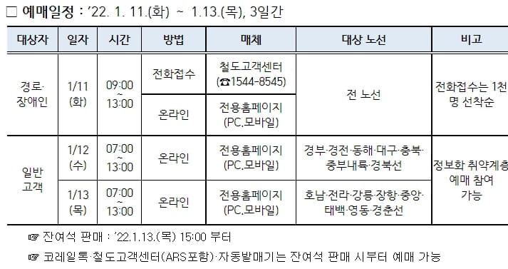 판매되지 않은 잔여석은 1월 13일 15시부터 역 창구·홈페이지·코레일톡 등 온·오프라인에서 일반 승차권과 동일하게 구입할 수 있다.