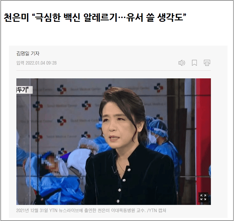 그동안 코로나 백신 접종을 적극 권장해왔던 천은미 이대목동병원 호흡기내과 교수가 정작 본인은 백신을 1차만 맞았다고 고백해 논란이 되고 있다.
