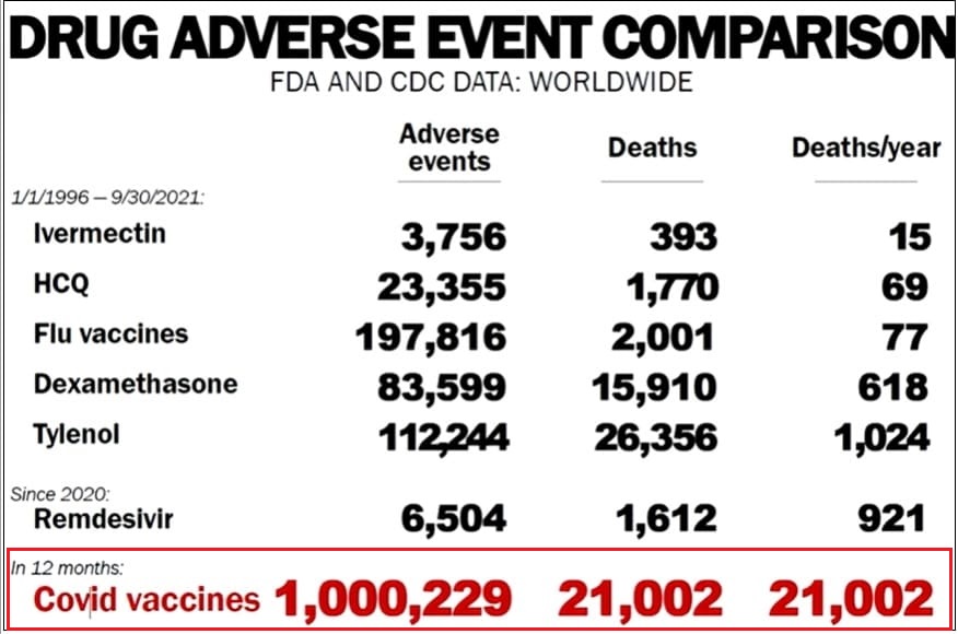 맨 아래 코로나 백신은 단 1년동안만 1백만명의 부작용과 21천명의 사망자를 냈다