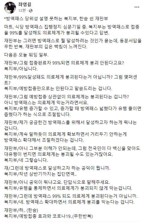 [언론 미보도 기사] 재판부 앞에서 방역패스 횡설수설하는 보건복지부...판사가 오죽 답답하면 한숨을 다...
