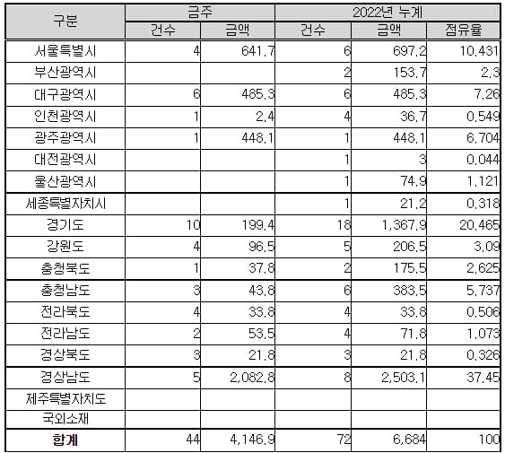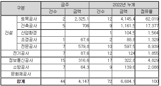 금주 집행예정인 44건 중 39건은 지역제한 입찰 또는 지역의무 공동도급 대상공사로, 1,553억 원 상당(37%)을 지역업체가 수주할 수 있을 것으로 예상된다.
