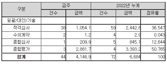 [조달청 금주 공사입찰 동향(’22.1.10.~'22.1.14.)] ‘국지도 58호선(송정IC~문동) 건설공사’ 등 총 44건, 4,147억 원(전주대비 161.6%)