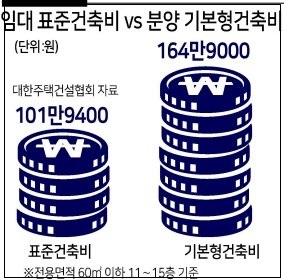 반면 아파트 분양가 상한제에 적용되는 기본형 건축비는 매년 3월과 9월 두 차례 조정된다. 정부가 지난해 9월 발표한 기본형 건축비는 25층 이하, 전용면적 85㎡ 아파트를 기준으로 3.3㎡당 687만9000원이다. 표준건축비가 기본형 건축비의 절반에 그치는 셈이다.