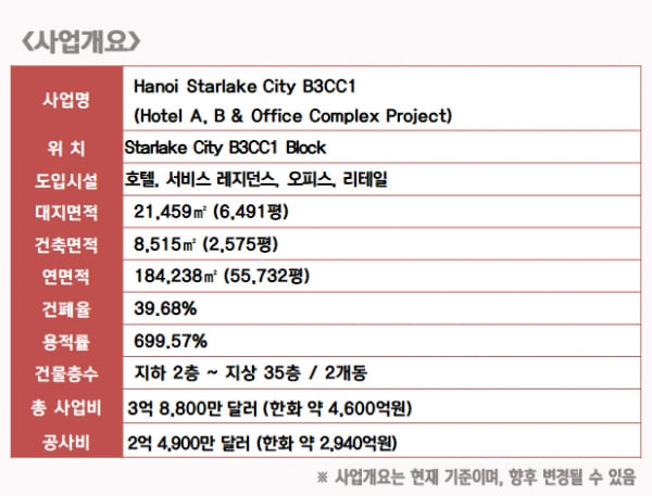 이 사업은 베트남 하노이 스타레이크 시티 B3CC1 블록 부지에 오피스와 호텔을 건설하는 사업이다.