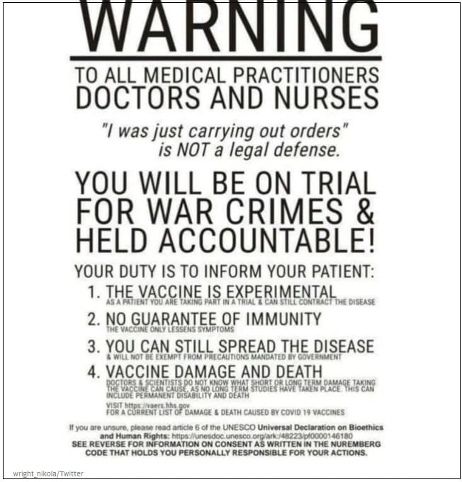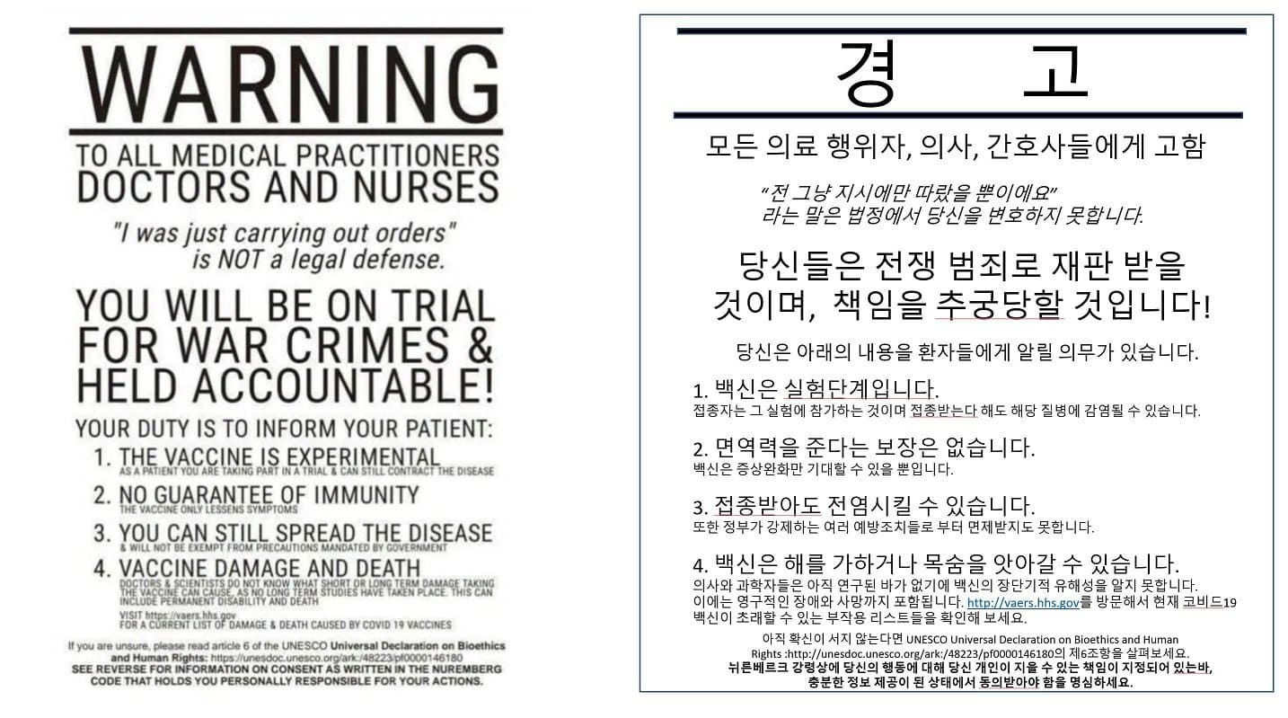 포스터는 백신이 실험적이고 면역력이 보장되지 않으며 백신이 알려지지 않은 장기적 효과를 가질 수 있다는 주장을 담고 있다.