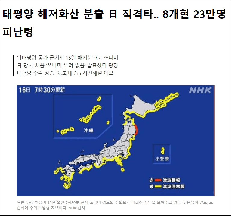 호주 기상청은 "통가의 수도 누쿠알로파에서 북쪽으로 약 65km 떨어진 헝가-헝가 하파이 해저화산의 분화로 1.2m 높이의 쓰나미가 발생했다"고 밝혔다.