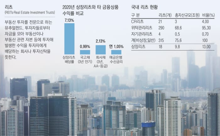 정부 집계를 보면 2020년 기준 상장리츠의 평균 배당률은 7.13%로, 은행권 수신금리(연 1.05%)를 압도할뿐더러 국고채·회사채(0.99~2.13%) 수익률과 비교해도 3배 이상 높았다. 기존 오피스 건물이나 주택에 국한되던 리츠의 매입 대상도 물류센터나 데이터센터 등으로 다양해지고 있다. 2017년 22개(34조원) 규모였던 국내 리츠 시장은 지난해 12월 기준 315개(75조6000억원)로 급성장했다.