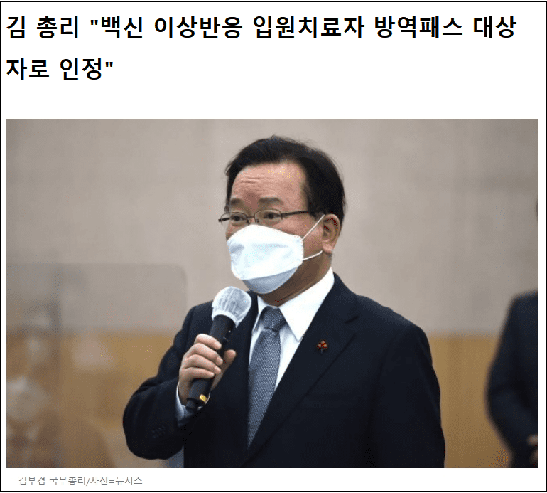 김부겸 국무총리가 19일 정부서울청사에서 열린 코로나19(COVID-19) 중앙재난안전대책본부 회의에서 "접종자와 미접종자를 함께 보호한다는 방역패스 제도의 취지를 살리고자 이상반응 때문에 입원치료를 받은 분들까지 방역패스 대상자로 인정해 드리고자 한다"고 밝혔다.