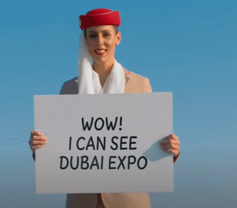 마지막에는 "드디어 내 친구들이여"라는 플래카드가 나타나는데, 그녀가 "A380의 상징인 A380을 날아라"라는 플래카드로 바꾸기 전 엑스포 도장이 그려진 에미레이트 항공 A380이 그녀의 뒤를 위풍당당당하게 지나가고 있다.