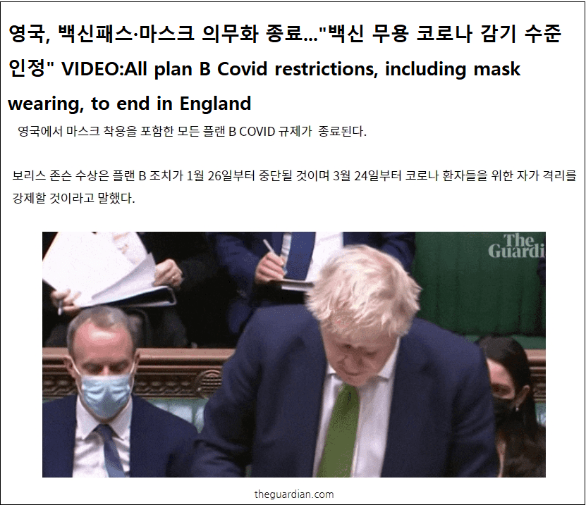 1월 26일부터 적용 한국도 즉각 따라 해야 영국에서 마스크 착용을 포함한 모든 플랜 B COVID 규제가 종료된다. 보리스 존슨 수상은 플랜 B 조치가 1월 26일부터 중단될 것이며 3월 24일부터 코로나