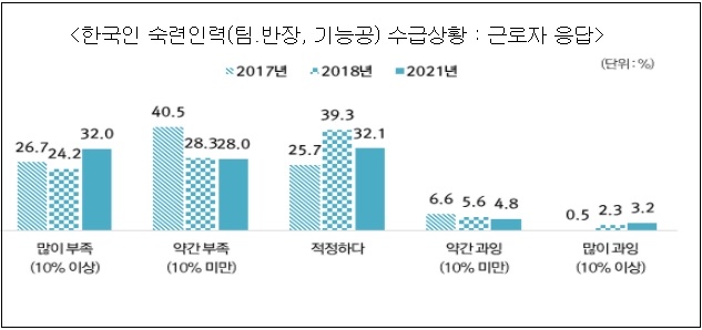 근로자 응답에서 한국인 숙련인력(팀.반장, 기능공)의 수급상황은 많이 부족 32%, 약간 부족 28% 등 부족하다는 응답이 적정하다는 응답 32%를 크게 앞질렀으며, 사업주 응답에서도 많이 부족 22%, 약간 부족 36% 등 부족하다는 응답이 적정하다는 응답 41%보다 많은 것으로 나타났다.