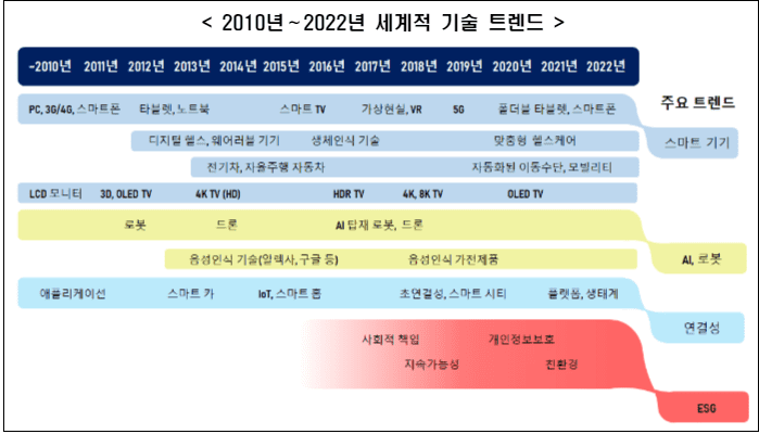 한국경제연구원(이하 ‘한경연’)은 2010년부터 2022년까지 CES에서 화제가 된 기술과 키워드를 분석한 결과, 세계적 기술 트렌드는 스마트기기, AI·로봇, 기기 간 연결성, ESG 등 4개로 분류되었다.