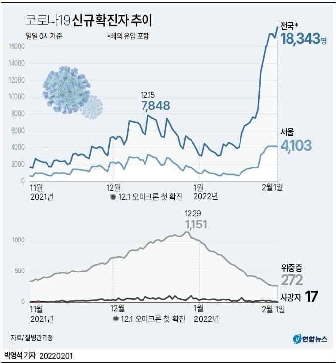 설 연휴에 코로나19 오미크론 변이가 급속히 확산하면서 1일 국내 신규 확진자 수는 역대 최다인 1만8천명대를 기록했다.