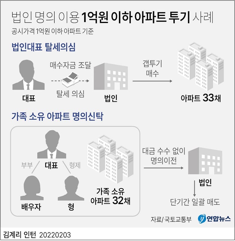 3일 국토교통부에 따르면 다주택자 중과세를 피하기 위해 법인 명의로 지방의 1억원 미만 아파트를 33채나 사들이는 등 투기가 의심되는 거래가 무더기로 적발됐다.