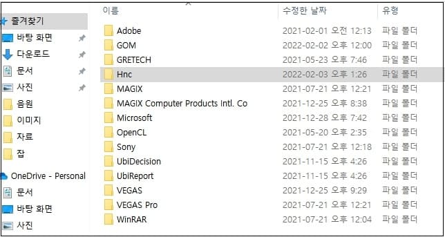 실행창에 %appdata% 입력 후 HNC 폴더 삭제