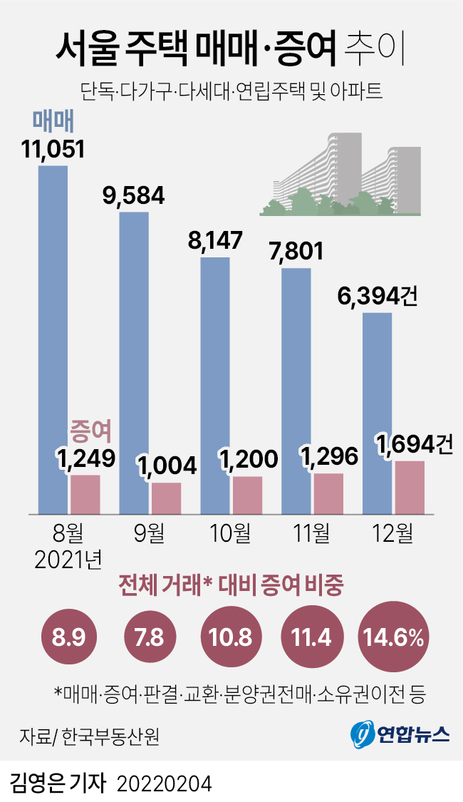 4일 한국부동산원의 주택 거래 원인별 현황 통계에 따르면 지난해 12월 서울의 주택(단독·다가구·다세대·연립주택 및 아파트 포함) 증여 건수는 총 1천694건으로 집계돼 같은 해 9월 1천4건, 10월 1천200건, 11월 1천296건에 이어 3개월 연속 증가세를 이어갔다.