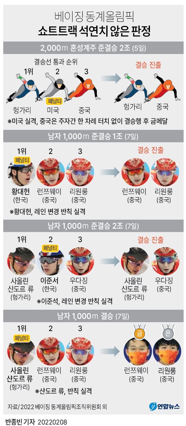 중국 선수가 출전한 쇼트트랙 경기에서 나온 석연치 않은 판정은 이번 뿐만은 아니다.