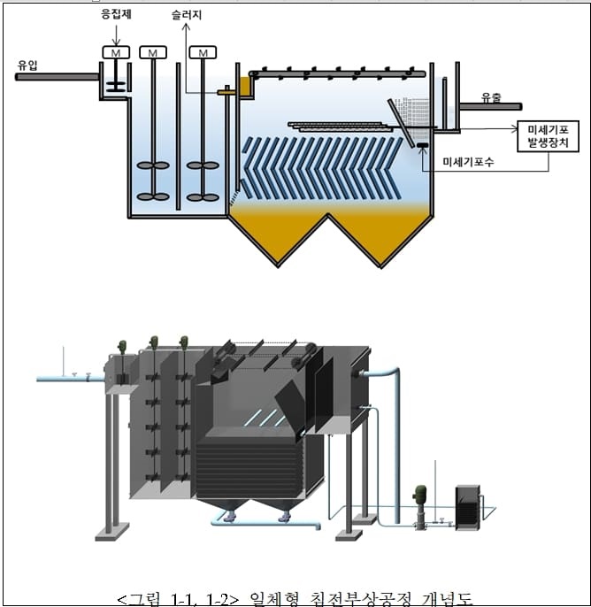 오염물질은 응집공정을 거치면서 다양한 성상과 크기의 덩어리(Floc, 이하 플록)를 형성한다. 밀도가 높고 입경이 큰 침강성 플록과 밀도와 입경이 작고 가벼운 부상성 플록이 함께 섞여 있는 상태가 된다. 침강성 플록은 먼저 침전공정(경사판침전부)에서 제거되고, 잔류하는 부상성 플록은 부상분리공정(부상분리부)에서 제거된다. 두 공정을 통해 깨끗해진 처리수는 유공관을 거쳐 최종처리수조로 배출된다.