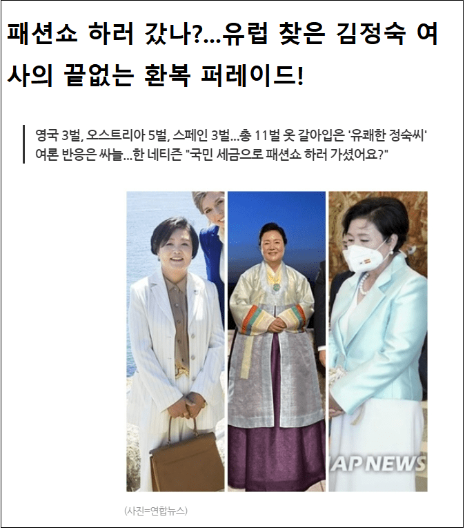 청와대는 당시 “대통령과 영부인 의전 비용은 예산에 명시적으로 편성돼 있지 않다”며 “국가 간 정상회담과 국빈 해외 방문, 외빈 초청 행사 등을 수행할 때 품위 유지를 위한 의전 비용은 행사 부대 경비로 엄격한 절차에 따라 필요 최소 수준에서 예산을 지원한다”고 설명했다.