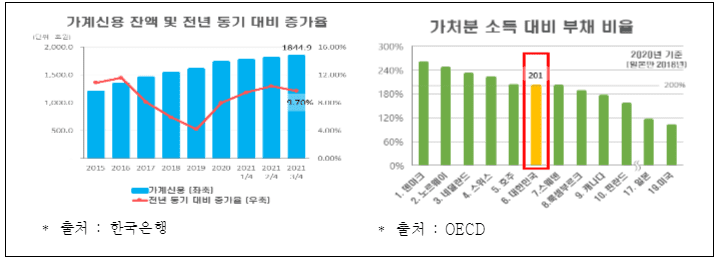 2021년 3분기 우리나라의 가계부채는 약 1,840조원으로, GDP 대비 약 96% 수준에 도달했다. 신용대출 규제로 증가세가 완만해졌음에도 가계의 순가처분소득 대비 부채비율이 201%에 달하여 채무상환 리스크가 커지고 있다.