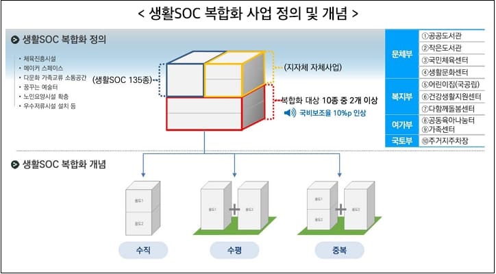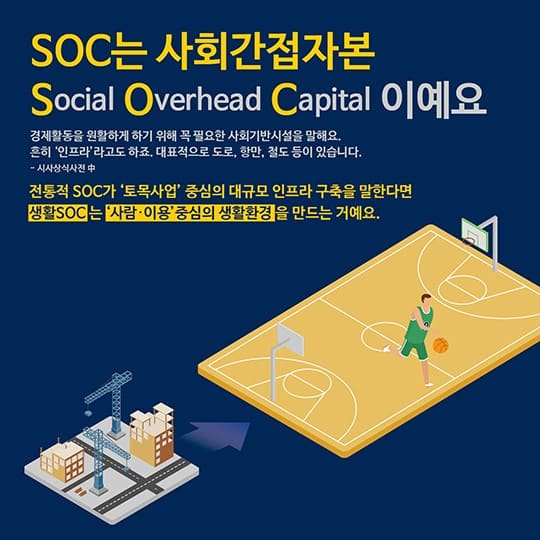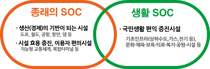 생활SOC는 국민 생활 편익 증진시설(상하수도가스전기 등 기초인프라 + 문화체육복지공원시설 등) 및 삶의 기본 전제가 되는 안전시설 등 일상생활에 필요한 필수 인프라를 의미한다.