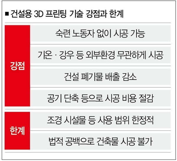 앞서 언급한 민간 건설회사들의 3D 프린팅 기술도 대부분 옥외 ‘조경 시설물’에만 적용되거나 건축물을 만든다 해도 ‘샘플’에 그칠 수밖에 없었던 이유가 여기에 있다.