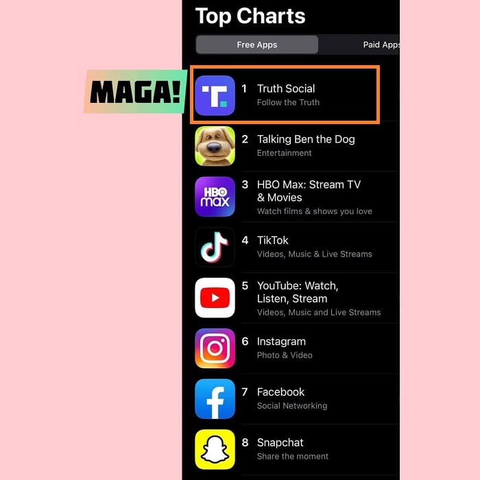 이 앱은 동부 표준시(ET) 자정(0500GMT) 직전에 출시되었으며 월요일 아침 앱 스토어에서 이용할 수 있는 최고 무료 앱이었다. 트루 소셜은 앱을 미리 주문한 사용자들의 애플 기기에 자동으로 다운로드되었다.
