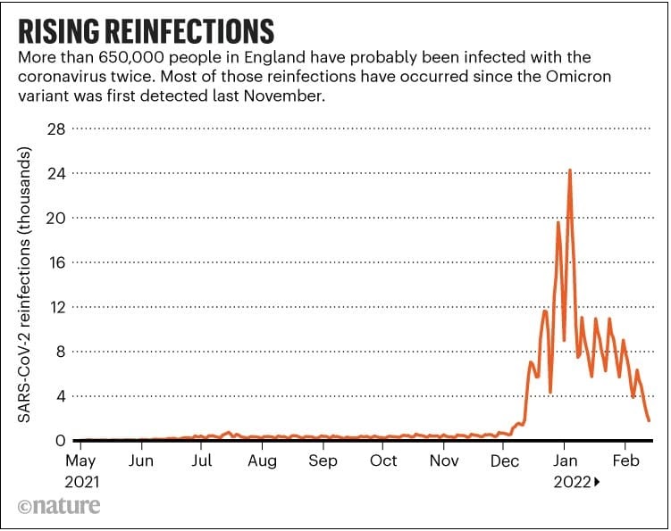SARS-CoV-2의 오미크론 변종이 처음 발견된 이후, 코로나바이러스에 재감염된 사람들의 수는 급격히 증가하고 있는데, 이는 이전 변종에서는 관찰되지 않았던 추세이다.