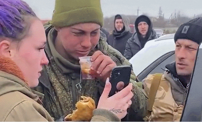(푸틴의 군대에 항복한 한 젊은 병사가 우크라이나 여성들의 위로와 음식을 받은 후 어머니와 통화하면서 눈물을 흘리며 무너지는 장면이 영상에 담겼다. 이 동영상은 우크라이나 국방부가 러시아 어머니들이 키예프에 와서 포로로 잡힌 아들을 데려올 수 있다고 밝히면서 알려졌다. 소셜미디어에 올린 검증된 글에서 관계자들은 만약 엄마가 자신의 아이가 감금되어 있다는 것을 알게 된다면 러시아에서 우크라이나 수도로 가는 힘든 여행을 할 수 있다고 주장했다.)