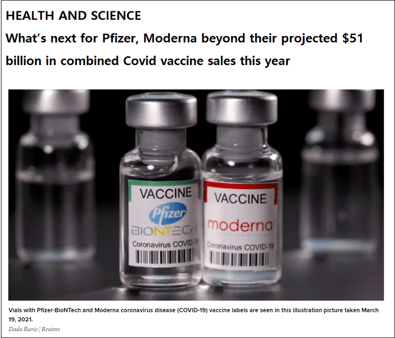 화이자는 2022년 코로나 백신 매출이 320억 달러, 모더나는 최소 190억 달러 매출을 예상하고 있다.