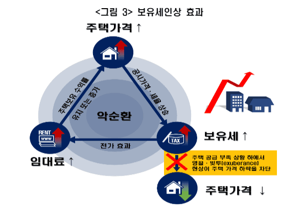 이승석 한경연 부연구위원은 “보유세 인상은 다주택 보유에 대한 부정적인 인식을 강조하는 동시에 주택보유 수익률을 낮춰 주택수요를 위축시키려는 목적이었으나, 결과는 반대로 나타났다.”라며, “주택가격은 오히려 더 가파른 급등세를 보였다”고 설명했다. 이 부연구위원은 “그 결과, 주택매매시장에서는 똘똘한 한 채라는 새로운 패러다임 속에 ‘영끌·빚투 현상’이 확산되고, 임대차시장에는 ‘20억 전세시대’ 개막과 함께 월세가속화 등 임대료 부담이 커졌다.”고 덧붙였다.