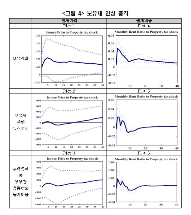 경연 보고서에 따르면, 종부세 등 보유세 인상으로 인해 임대차 거래 중 월세비중이 5%이상 늘어난 것으로 분석*되었다. 보유세율 뿐만 아니라, 보유세율의 대리변수**로 볼 수 있는 ‘보유세 관련 뉴스건수’나 ‘증여 중 공동명의 비율’을 통한 추가적 분석에서도 비슷한 결과가 나타났다.