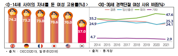 우리나라의 여성 고용률이 낮은 주된 이유로 육아가 꼽히고 있다. 실제 0~14세 사이의 자녀를 둔 여성 고용률은 57.0%에 불과했는데, 이는 OECD 33개국 중 멕시코, 코스타리카 다음으로 낮은 31위다. 또 30대 여성의 경력단절 사유로는 육아가 47.6%로 절반을 차지했으며, 임신출산과 결혼이 그 뒤를 이었다.