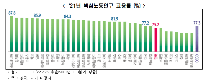 우리나라의 핵심노동인구의 고용률은 75.2%로 OECD 36개국 중 29위로 낮은 것으로 나타났다. 주요국 중에서는 미국이 77.2%로 OECD 평균 77.3%에 못 미쳤으나 일본 85.9%, 독일 84.3%, 프랑스는 81.9%를 기록해 우리나라와 격차가 컸다