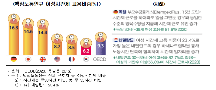 한경연은 여성 고용률이 높은 주요국은 시간제 근로제를 활용해 여성의 노동시장 참여 기회를 적극 보장하고 있음을 지적했다. 30대 여성 고용률이 81.8%에 이르는 독일은 ‘부모수당플러스’라는 제도를 통해, 핵심노동인구 여성 시간제 고용 비중이 23.4%로 가장 높은 네덜란드의 경우 노·사·정 합의(바세나르 협약)를 통해 시간제 근로를 활성화시켰다.