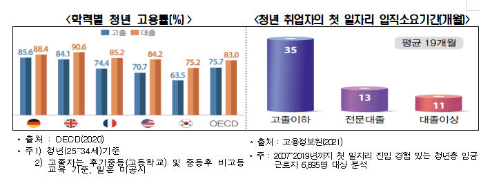 우리나라 고졸 청년 고용률은 63.5%로 34개국 중 32위로 최하위권을 기록했다. 이처럼 고졸 청년들의 취업이 어렵다보니 졸업 후 첫 직장을 갖는 입직 소요기간이 고졸자들은 평균 35개월이나 걸렸는데, 이는 대졸자들의 입직 소요기간 11개월에 비해 3배나 더 긴 수준이었다.