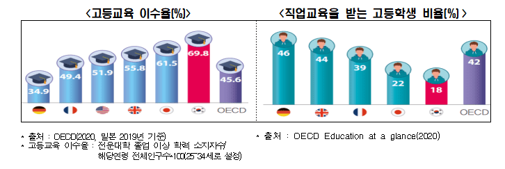 학생들은 취업을 위해 불가피하게 대학에 진학할 수 밖에 없는 분위기다. 통계청 조사에 따르면 초중고 학생 10명중 9명은(89%) 대학 이상 교육을 원했는데, 주된 이유는 “좋은 직업을 갖기 위해서”인 것으로 나타났다2). 실제 우리나라의 고등교육 이수율은 69.8%로 OECD 34개국 중 가장 높은 수준이다.