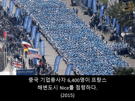 몇 년 전인 2015년 5월 9일, 중국의 한 기업이 여러 편의 전세 비행기로 회사의 종사자 6,400명을 같은 날, 같은 시간에 프랑스 남단 니스(Nice) 해변에 풀어놓았습니다. 호화롭기로 이름난 불루바드(Boulevard) 거리가 중국 방문객으로 발 디딜 틈 없이 ‘꽉 찬 것입니다’.