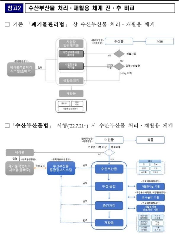 또한, 수산부산물을 재활용할 수 있는 유형도 확대하였다. 기존 「폐기물관리법」 체계에서는 수산부산물을 건축자재 원재료, 비료, 사료, 공유수면 매립지역의 성토재 등으로 재활용할 수 있었으나, 앞으로는 이뿐만 아니라 석회석 대체제, 화장품, 의약품 및 식품첨가물 원료 등으로 재활용할 수 있다.