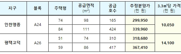 3.3m2(평) 당 추정분양가는 인천영종은 10,050천원 수준, 평택고덕은 14,100천원 수준이 될 전망이다.
