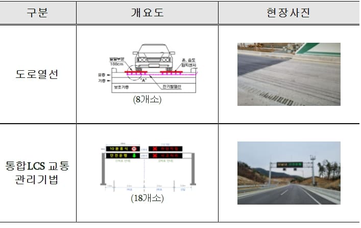 실시간 전방 교통상황을 알려주기 위해 통합 차로제어를 통한 효율적 교통관리(18개소) 기법을 도입하였고, 도로 살얼음 예방을 위해 터널 진·출입 구간에 도로열선(8개소)을 설치하였다.