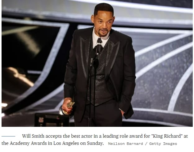"킹 리처드"에서 오스카 남우주연상을 받은 스미스는 나중에 그의 얼굴에 눈물이 흘러내리자 영화 아카데미와 그의 동료 후보자들에게 사과했다. 그러나 그는 록에게 말을 걸지 않았고 그가 한 일을 정당화하려고 시도했다.