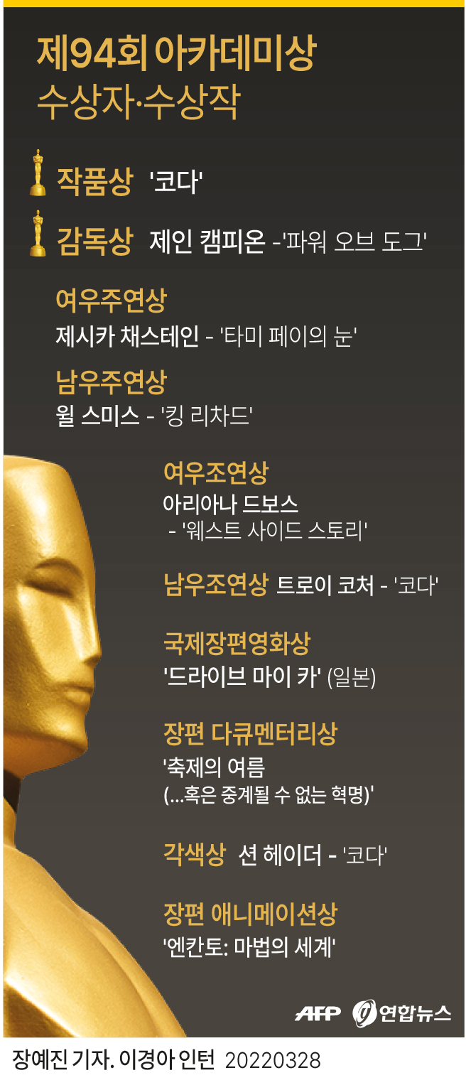 미국 영화예술과학아카데미(AMPAS)는 27일(현지시간) 로스앤젤레스(LA) 돌비극장에서 열린 제94회 시상식에서 작품상 수상작으로 션 헤이더 감독의 '코다'를 선정했다.