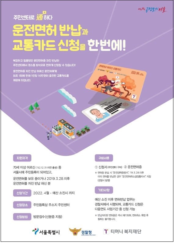 서울시는 「고령 운전자 면허 자진반납 원스톱서비스」를 통해 어르신들의 면허 반납과 교통카드 수령 과정을 더욱 편리하게 지원하고 있다. 면허 반납을 원하는 어르신은 경찰관서의 방문 없이 주민센터에서 반납 신청부터 교통카드 수령까지 한 번에 가능하다.